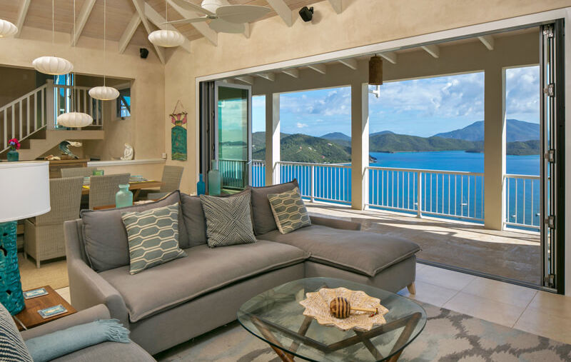 Stepping inside, you’ll find an elegant yet comfortable interior, where the carefully chosen color palette and furnishings create a serene and welcoming atmosphere. The multi-level design features an open floor plan with the great room and a covered deck on the main level, one master bedroom on the upper level, and three additional master bedrooms, each with its own private outdoor seating area, on the lower levels. All floors are connected by an interior staircase, a design feature not commonly found in the Caribbean, which adds to the villa's appeal.