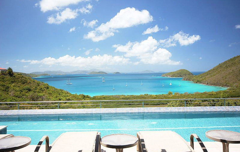 As you enter the villa through its grand double doors, you'll be greeted by a breathtaking panoramic view of Francis Bay. Stepping further through 14-foot sliding doors leads you to an expansive pool patio, offering stunning views of the Bay from every angle and lounge chair.
