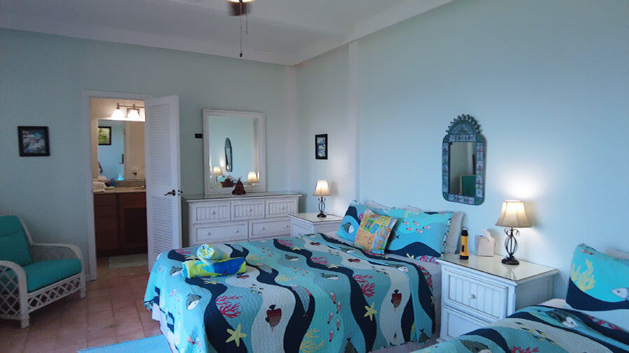 To the left of the main house is one master bedroom, while an exterior staircase leads to the second master bedroom on the upper level. The third guest bedroom, along with the pool and pool deck, is located on the lower level and can be accessed via two sets of stairs on either side of the main house or by a gated path from the driveway. Each bedroom is equipped with air conditioning, an en-suite private bath, and a private balcony overlooking the stunning turquoise waters of the Caribbean below.