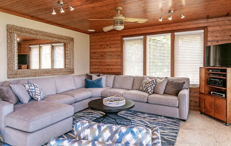 Seaside Breeze features unique design elements, including floor-to-ceiling windows with large trapezoid windows on both the front and back (east and west) sides of the house. These oversized windows, along with coral stone tiled floors, an open floor plan, and cedar woodwork, create a bright, attractive, and inviting interior. The great room is equipped with a Bluetooth-enabled audio system and 8 speakers, allowing music to be enjoyed throughout the space or in selected zones. Unlike many homes in St. John, Seaside Breeze is insulated, ensuring a cool and comfortable environment.